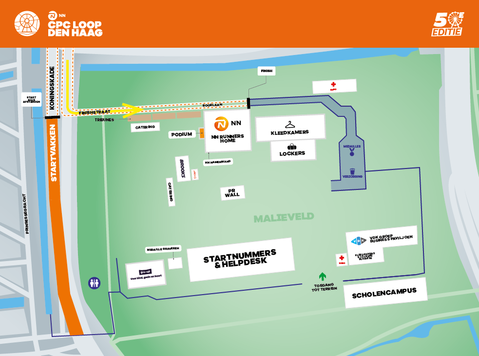 The changing facilities are located on the event grounds at Malieveld. These facilities are exclusively for participants and not accessible to accompanying persons. Access to the changing facilities before and after the NN CPC Loop The Hague is only permitted upon presentation of your bib number.